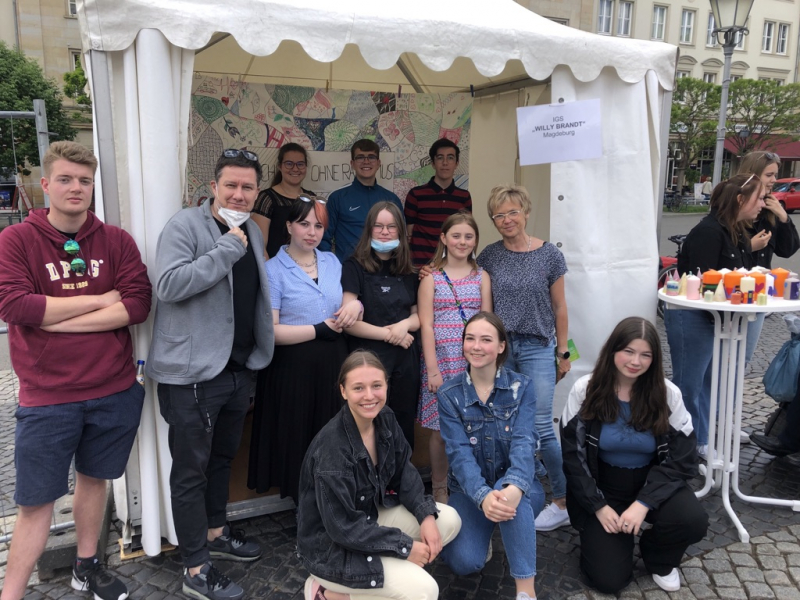Am Stand der IGS "Willy Brandt" wurden selbsthergestellte Kerzen und Kuchen angeboten sowie mit vielen Magdeburgern ein Zentangle gestaltet. Ebenso wurde eine von Schülern konzipierte Bauzaunausstellung zum Thema: "Jüdisches Leben in Magdeburg" präsentiert werden. Der Schülerrat um Frau Selle freute sich sehr über die persönliche Teilnahme unseres Schulpaten Sören Thümler.